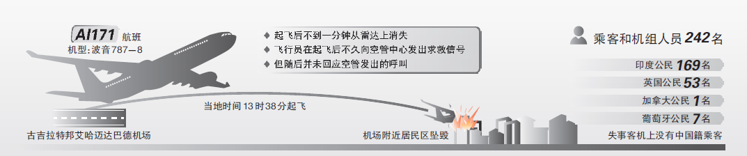 失事客机是印度航空AI171航班,于当地时间13时38分从印度古吉拉特邦艾哈迈达巴德机场起飞,在机场附近居民区坠毁。该客机原定飞往英国伦敦盖特威克机场。