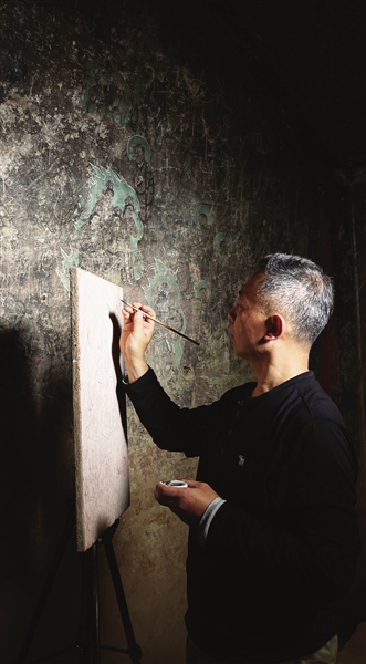 赵栗晖在石窟进行临摹。