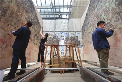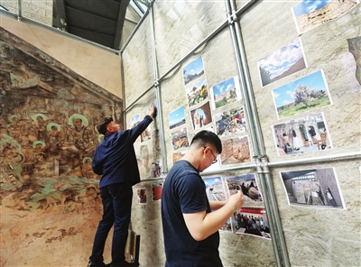 在展示现场,“移动敦煌”采用管架和模块搭建,既可以拆卸转运,又可以进行动态绘画展示。