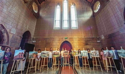 天津工艺美术职业学院综合绘画系学生用画笔展现天津文物保护建筑的百年风华,用艺术方式生动诠释了“文物保护,从我做起”的理念。 记者 曹彤 摄