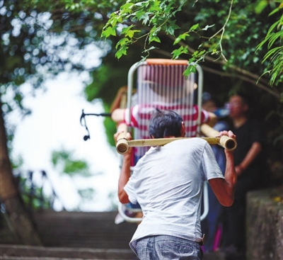 向上的时候,我能看见前面轿夫向前攀登吃力的样子,他身体在抖,花白头发也随着抖动,贴身的汗衫很快出现了汗的“斑点”,没有湿透,但行进中可以看出“斑点”在不断增多,就像这个年纪的人肉眼可见地在衰老。在行进中,后面轿夫的样子我看不见,只听见他吭哧的喘气声。我就问,你们两位一前一后是谁吃力更大?他们说当然是在后面的,但前面的人显然也并不轻松。