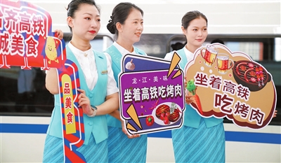 6月18日,在由哈尔滨西开往齐齐哈尔南的D6993次动车组列车上,中国铁路哈尔滨局集团有限公司联合黑龙江省文旅部门,开展齐齐哈尔烤肉美食文化体验活动。活动邀请专业厨师现场展示烤肉制作过程,并与旅客互动。 新华社发