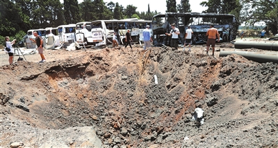6月17日,在以色列中部城市海尔兹利亚,人们查看导弹袭击留下的弹坑。 新华社发