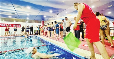 昨天,红桥区西沽街水木天成第三社区联合水木天成游泳俱乐部游泳馆举办迎“七一”游泳比赛。记者 刘欣 摄