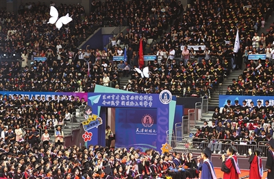 天津财经大学2025届学生毕业典礼上,伴着师生所唱的《一路生花》,8只灵动的仿生蝴蝶“飞”入毕业典礼的现场。“我们把今年央视春晚舞台上的仿生蝴蝶‘请’到本届学生毕业典礼现场,勉励学子在人工智能时代注重科技创新,也祝福同学们带着梦想和希望展翅高飞。”天津财经大学团委副书记曾欣告诉记者,考虑到仿生蝴蝶的制作者是来自我市蓟州区的青年创业团队,蝴蝶又与歌词内容适配,所以专门设置了这一表演环节,既能让毕业典礼科技感十足,也可引导学子对未来智能时代的思考。“仿生蝴蝶登上春晚舞台后,学校便和我们团队沟通亮相学生毕业典礼的事宜,双方准备了好几个月。”仿生蝴蝶的制作者、“飞行小匠”团队负责人李建向记者介绍,为了此次财大学生毕业典礼,团队特别对仿生蝴蝶进行了飞行程序的优化和翅膀颜色的涂装,从而为毕业生打造充满仪式感的离校体验。果然,当天典礼现场,仿生蝴蝶甫一亮相,立刻点燃全场热情。不少毕业生纷纷拍照,并感叹:“这份独特的校园记忆,让我们带着创新的激情,奔赴人生下一程。”