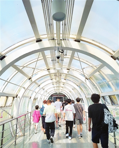 在瑞景新苑站,从站台到出站阶梯之间有一个圆形玻璃通道,长度不到30米。中午时分,阳光从上面照射进来,让通道里酷热难耐,乘客争相加快步伐通过。