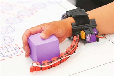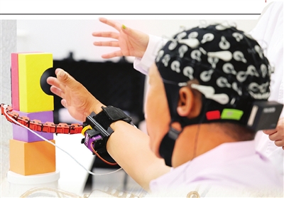 这一次,张先生是来做“灵犀指”训练的随访,科研人员和医生希望通过手指精细动作训练观察康复效果的保持情况。科研人员调试好设备后,先为张先生戴上有64个电极的“脑电帽”,并在每个接口中注入导电凝胶,然后将“灵犀指”装置固定在右手腕。“手不动,只用脑子想”,经过几分钟准备,张先生开始“用意念指挥手指”,成功地启动“灵犀指”,并将两个方块摞放起来。之后,科研人员不断增加动作难度、扩展上肢活动范围,改变抓握物体形状,张先生均顺利完成。