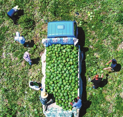 连日来,津城持续被高温“炙烤”。作为天津特色农产品之一的静海台头西瓜迎来销售高峰。瓜农们头顶烈日在田间地头抢收西瓜,及时为市民送上“甜蜜清凉”,保障夏日水果市场供应。 记者 潘立峰 摄