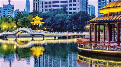 目前,人民公园夜景灯光提升改造项目基本完工。傍晚时分,公园内的亭台楼阁、绿植水景被灯光点亮,夜景美不胜收。
