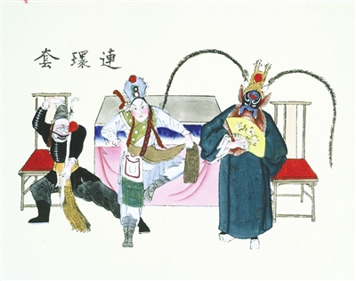 后来,戏曲题材进入杨柳青木版年画,尤其到了清光绪年间,天津戏园子演出梆子、皮黄“两下锅”,一时间京津戏曲演出呈现出前所未有的兴旺局面。杨柳青的地理位置,去北京水路、陆路十分近便,于是,年画作坊老板便聘请画师随时到北京、天津的戏园子观摩演出实况,记下不同剧目的精彩场面、不同演员的舞台风貌,然后凭记忆进行创作。画师反复修改画稿后,由刻工刻成墨线版,再依画师要求刻出黄、绿、蓝、灰、紫、红多个套色版,精品还要加金色版套印,有的还用手工开脸儿做色彩加工,成品画就像工笔重彩的写实绘画一样。