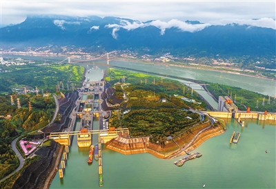 7月1日,在湖北宜昌,船舶有序通过三峡双线五级船闸和升船机(无人机照片)。
