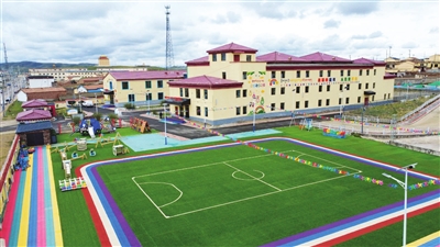 黄南州泽库县泽曲镇中心幼儿园建设项目2020年竣工,总建筑面积4320平方米,天津援建投资主要用于建设室外儿童游乐设施、校园绿化、道路硬化、雨水管网、室外照明以及教师周转房等。不仅为孩子们营造了安全、舒适、美观的学习和生活环境,也为教师们提供了坚实的后勤保障,见证了津青两地携手推进教育事业的深厚情谊。上图为泽库县泽曲镇中心幼儿园内孩子们在老师陪伴下做游戏。右图为天津援建的泽库县泽曲镇中心幼儿园外景。