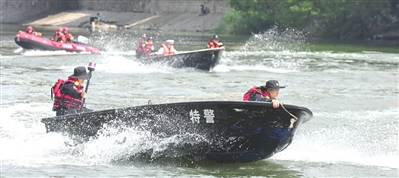 昨日,市公安局治安管理总队联动相关部门在子牙河耳闸水域组织开展2025年防汛救援暨水上突发事件应急处置联合演练。