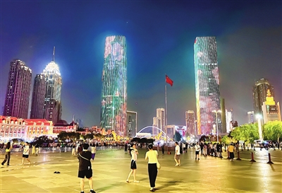 近日,网上爆火的天津海河夜景视频引发打卡热潮,夏夜的海河两岸灯光璀璨,光影交织的绚丽景观吸引众多游客专程来到天津站前广场,举着手机寻找最佳机位,效仿视频拍摄同款流光溢彩的都市夜景。 记者 孙立伟 摄
