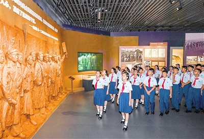 7月7日,北京市第十二中学的少先队员参观《为了民族解放与世界和平》主题展览。 新华社发