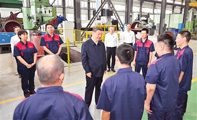 7月7日至8日,中共中央总书记、国家主席、中央军委主席习近平在山西考察。这是7日下午,习近平在阳泉阀门股份有限公司考察时,同企业员工亲切交流。 新华社记者 燕雁 摄
