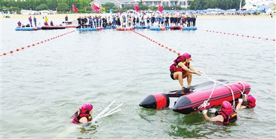 本报讯(记者 马晓冬 宁广靖 万红)昨日,一场“水上比武”在东疆湾沙滩景区上演——2025年天津市水上搜救技能比武暨第二届环渤海水上搜救技能交流活动拉开帷幕,吸引了来自天津、辽宁、河北、山东的20支水上搜救队伍共220名选手参与。