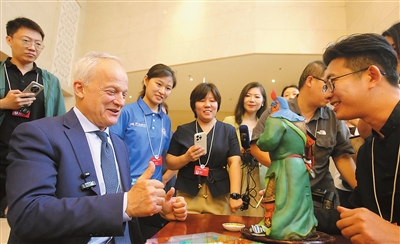 昨天上午,在“世界市长对话·上合峰会城市”活动现场,一方非遗展区成为了最动人的“文化客厅”。杨柳青年画的吉祥画面、泥人张彩塑的灵动神韵、曾氏华服的华美工艺、中国日报展区的创意表达,吸引着各国嘉宾驻足流连。他们或俯身细赏,或轻声赞叹,或举起手机记录,仿佛走进了一座微缩的东方艺术殿堂。