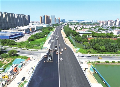 7月10日,由驻津央企中国铁建大桥局承建的张家港高铁新城市政项目东南大道至金港大道段高架桥上机器轰鸣,正式开始高架桥面沥青摊铺作业。