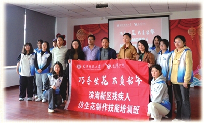 学校创新提出“学习型社会建设”战略路径,深入开展“区校终身学习联合体”工作,打造“教育+社会服务”双向赋能模式。通过整合校内外资源,构建覆盖全年龄段、全群体的终身学习网络,使教育成为城市文明进步的推动力。学校“光艺创意文创工坊”项目,借助非遗活化与数字赋能,构建起“终身学习+精准助残”新模式,助力残疾人就业与乡村振兴,为学习型社会建设提供实践样本。依托天津丰富的非遗及文创资源,精心筛选永生花、盐雕、大漆等20项适合残疾人学习操作的技艺,并创新推出“1+4+N”助残体系。截至2024年,工坊活动已在全国8省23地落地,让5300余名残疾人受益。学校与滨海新区成立“区校联合体”,开展的《老年人婚姻及旅游常见法律问题剖析》讲座,开创“法律+民生”服务新模式,建立社区法律咨询长效机制,提升老年人法律素养与风险防范能力。