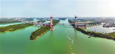 这是沪渝蓉高铁跨京杭运河斜拉桥施工现场(7月13日摄,无人机照片)。新华社发
