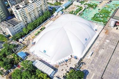 本报讯(记者 史莺)近日路过红旗路的市民发现,赛德广场旁一个高约25米、最长一侧约95米的巨大白色“充气枕头”拔地而起。这里面到底藏着怎样的秘密?原来这是全市首个基坑气膜全封闭施工系统,吹起的气膜里包裹着南开区天津大学爱尔眼科医院项目的施工现场,本周正式启用。“可别小看这气膜,它就像工地的‘金钟罩’,能阻隔90%的扬尘、有效降噪40分贝,还能遮阳挡雨,预计能缩短两个月的工期,经济又环保!”昨天,在项目现场,中建六局所属中建城市建设发展有限公司总经理曾坤建笑着说。市生态环境局总工程师兼大气处处长邓小文表示,该施工系统在城市核心区域开辟了绿色建造、智慧施工创新路径,也为超大城市精细化环境管理提供了解决方案。