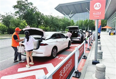 昨天9:00刚过,天津滨海机场迎来多架次航班密集到港,位于机场交通中心A岛东侧的网约车上车点迎来了不少候车旅客。随着网约车相继停靠在专用泊位上,旅客们安放行李、上车落座后,车辆即刻驶离。