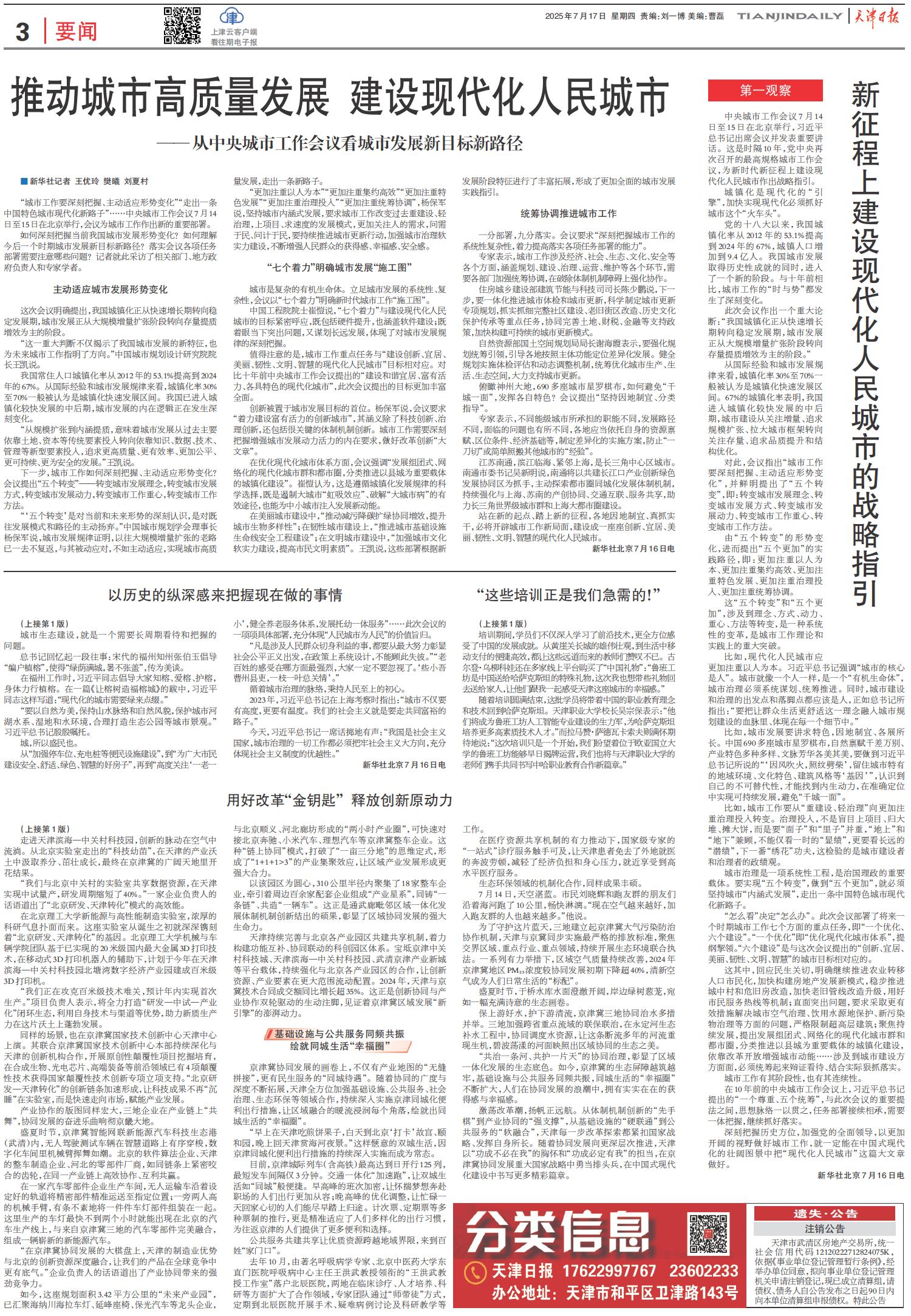 推动城市高质量发展 建设现代化人民城市