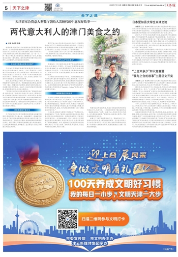 在天津工作期间,雷雷还觅得佳人,与一位天津姑娘喜结连理,如今两人的儿子已经8岁了,成长得活泼可爱。“孩子在天津的公立小学读书,能说一口流利的中文,意大利语却磕磕巴巴。”雷雷耸了耸肩,笑着说:“可能是因为孩子兼具中国和意大利血统,他不仅钟爱意大利餐,喜欢爷爷做的比萨、意面,对天津美食煎饼馃子、饺子、捞面也是百吃不厌。”