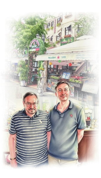 盛夏夜晚,霓虹闪烁,古朴浪漫的意式风情区愈发唯美生动。步入威尼斯意餐酒吧的小庭院,常常可以见到一对意大利父子的身影,他们与食客聊天,畅谈天津的风土人情;与厨师交流,研究菜品的提升创新。这一老一少、一胖一瘦父子俩扎根天津意风区从事餐饮业十余年,本身也成为这里的一道风景线。他们的故事如同餐厅墙上的老照片,记录着两代人对这座城市的深情。