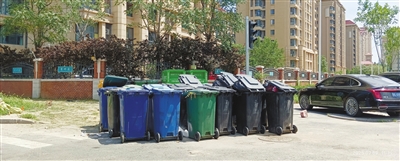记者在现场看到,垃圾桶集中摆放处位于秀竹苑小区院墙外的非机动车道上,距离该小区8号楼约10米。不少垃圾桶满满当当的,盖不上盖子。垃圾桶旁边,还堆着一堆生活垃圾。记者采访时,一辆环卫清运车前来作业。车上的工作人员说,这些垃圾桶是临时放到这里的,因为他是替班的,只知道到这儿来运垃圾,其他情况不清楚。