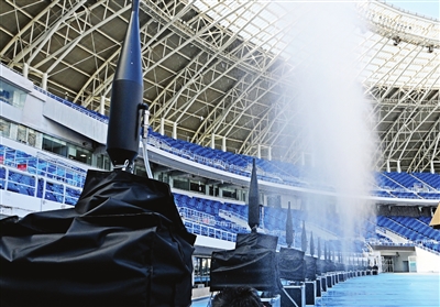 据体育场相关工作人员介绍,80门“水炮”围绕内场周边摆放,其中一部分还可以覆盖首层看台的大部分区域。目前,“水炮”已全部安装到位并与整个水路系统联通,当为“水炮”供水的注水箱水位下降到一定程度后,水泵将自动启动,将自来水输送到注水箱中,保证“水炮”的出水正常。此外,“水滴”体育场还为观众准备了80000个降温贴,竭力提升观众的观看体验。