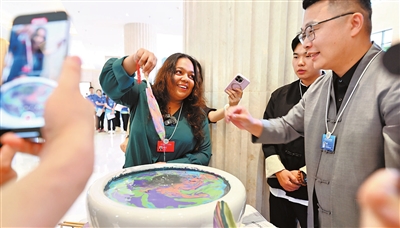 天津郑氏漆器的展台前人头攒动。北京大学国际关系学院在读博士、俄罗斯留学生罗维卫现场体验了漂流漆画扇的制作。“漆液在水面流动的轨迹就像丝绸一样柔美。”罗维卫轻轻拨动水面上的彩漆,漆液在水中舒展、变幻色彩。随后,他将团扇缓缓浸入,快速抽出,一幅独一无二的漆画便跃然于扇面。他兴奋地说:“每一把扇子都是不可复制的艺术品,正如每个文明都有自己独特的魅力。这项来自天津的非遗技艺,让我们感受到了天津海纳百川的包容气质。”