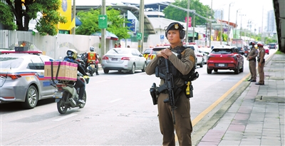 图为在泰国曼谷,安全人员在枪击事件现场附近警戒。