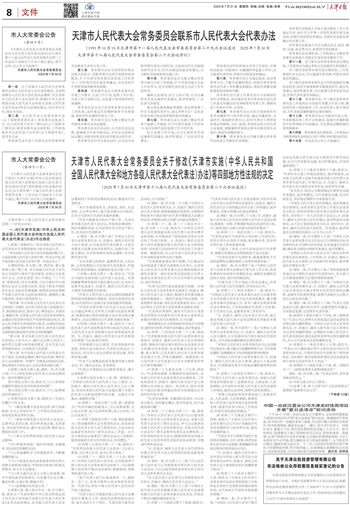 《天津市人民代表大会常务委员会联系市人民代表大会代表办法》已由天津市第十八届人民代表大会常务委员会第二十次会议于2025年7月30日修订通过,现予公布,自公布之日起施行。