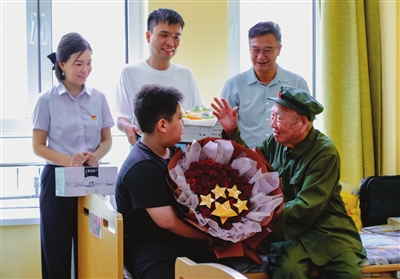 “八一”建军节来临之际,西青区精武镇潘楼村党支部党员和青少年代表走访慰问本村的95岁抗美援朝老战士高云亭,向战斗英雄致以崇高敬意。老战士嘱托孩子们铭记历史,奋发图强,让红色精神薪火相传。