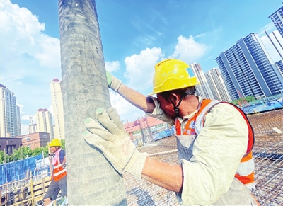 天津南开学校教育集团新建初中项目工地上,中建五局的混凝土工人们每天穿着防护服进行混凝土浇筑,确保新校区如期交付。