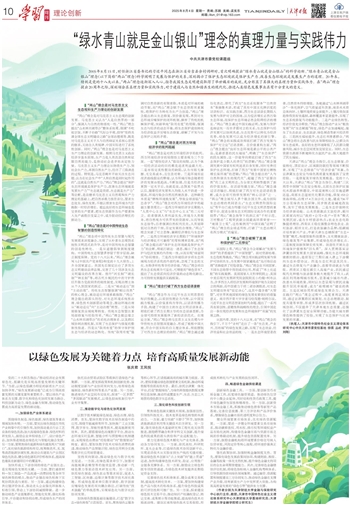 天津以“两山”理念为指引,在生态修复、价值转化、顶层设计、区域联防联控等领域不断探索,实现了“生态颜值”与“经济价值”双赢,为京津冀生态安全与绿色高质量发展提供了宝贵经验。一是修复筑牢绿色发展根基。党的十八大以来,天津以“两山”理念为指引,构建“三区两带中屏障”生态安全格局,北部生态保护区强化水源涵养林建设,中部湿地核心区实施退耕还湿,南部生态湿地优化蓄洪功能,修复153公里海岸线,治理17.4万亩沙化土地,建成736平方公里绿色生态屏障,同步推进盐碱地改良等,筑牢了绿色发展根基。二是生态价值转化为经济新动能。山水资源激活文旅经济,蓟州区郭家沟村以“政府+公司+农户+资本”模式发展民宿,成为乡村旅游热点;农业生态化助推提质增效,西青区王稳庄镇整合特色农业、农村旅游、稻田文化,打造农旅融合品牌;低碳城市培育新兴产业,中新天津生态城探索“生态+智慧”模式,构建智能科技服务、文化健康旅游、绿色建筑等产业集群,形成绿色经济增长点。三是制度创新保障长效发展。创造性开展生态环境保护督察和“回头看”。深入贯彻落实京津冀协同发展重大国家战略,强化生态环境联建联防联治,连续签订三期引滦入津上下游横向生态补偿协议。四是生态红利惠及民生。通过生态修复与产业融合,直接带动就业与增收。西青区王稳庄镇引入高端产业,农民通过现代化种植与旅游服务极大地提升了收入;武清区利用海绵城市技术,显著减少城市内涝,改善水环境质量,同时以生态景观与便民设施提升居民幸福感,成为“海绵城市”建设的典范。五是区域协同形成绿色发展合力。天津在践行“两山”理念过程中,高度重视区域协同,通过京津冀跨区域规划、生态治理联动、制度共建等举措,形成多层次协同机制。通过区域协同,不仅提升了天津本地生态质量,还强化了京津冀生态安全屏障功能,为超大城市群绿色转型提供了经验,实现了生态保护与区域发展的双赢。