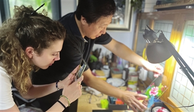 张春林还为萝拉演示天津玻璃画创作中“染”的过程。“与在纸上作画的最大不同,在玻璃上作画是反着画。如何让画在玻璃上附着并长时间保持,这里的用色技巧是父亲传授给我的。”说话之间,一朵色彩艳丽、婀娜多姿的牡丹呈现在玻璃上。萝拉一边用手机记录下创作过程,一边惊叹张春林绘画技艺的高超。
