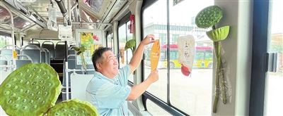 在806路终点站智达道公交站,驾驶员陈洪云提早将莲蓬和立秋诗词卡片点缀在车厢窗框处,并在发车前为乘客送上翠绿莲蓬,“立秋吃莲子,祛暑又润燥。大家尝个鲜。”