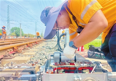 蹲在21号道岔旁,程世发正拿手锤敲打着道岔螺栓,边敲边听,汗水顺着他黝黑的脸颊滑下,滴在灼热的轨面上。“什么样的声音螺母是松动的,什么样的声音是正常的,我们基本上一听就知道。”程世发说。