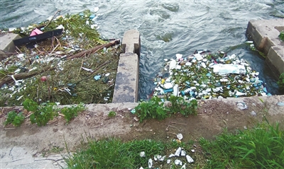 记者在武清区徐官屯街道宝稼营村现场看到,龙凤河与北运河交汇处有两口泄洪闸,其中一个已打开,另一个闸口不见水流,有大堆杂物堆积。沿着护坡上的步道走近河边,杂物已将闸口前的箱形水利设施填满,任凭旁边的水流多么湍急,这些杂物也不见动静。杂物中除了各种生活废弃物,还有大量的树枝、树叶,包括读者提到的那根直径约20厘米粗、近10米长的树干。