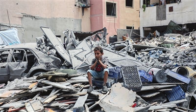 8月8日,一名男孩坐在加沙城以军袭击后的废墟上。