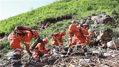 8月11日,武警甘肃总队继续投入400余名兵力在兰州市榆中县兴隆山村、马莲滩村、小康营村等地开展失联人员搜寻、居民区清淤、物资转移、医疗巡诊等任务。 新华社发