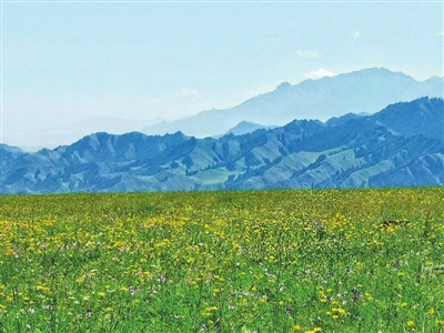 正前方是低谷丘陵地带,皆被绿草所覆,极目远眺,连绵起伏,似绿色的波浪滚涌向远方,一洗青碧到雪山。微风中恣意摇曳的,是一簇一簇或成片成片的野花。更为远方的山坡上,云杉如帐,林下马鹿呦呦。这里珍稀动物还很多,可常见北山羊、雪豹、狐狸、雪鸡等。