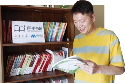 单增运在“1平米书架”旁阅读。 津云新媒体供图