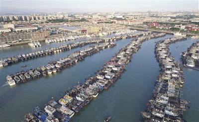 图为8月12日,渔船在福建厦门高崎闽台中心渔港躲避台风(无人机照片)。
