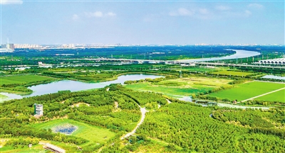 连日来,海河畔的津南绿屏·辛庄湾满眼苍翠,与海河水面相映成一幅美丽画卷。 记者 潘立峰 摄