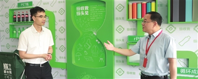 天津市经开区生态环境局走进厂区生态展厅,参观“回收我·回头见·回来了”主题展览,展板上呈现了PET瓶从回收、加工处理后成为颗粒或线轴、布料,最终重塑为饮料瓶或艺术装置的技术路径。