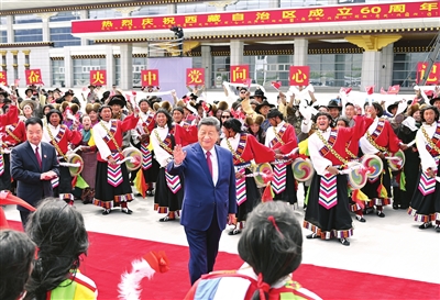 习近平离开西藏时,各族群众纷纷来到拉萨市区的沿途道路两旁,挥舞红旗、手捧哈达,欢呼着向总书记问好,向总书记表达由衷的爱戴。拉萨贡嘎机场,身着节日盛装的干部群众挥舞着红旗和花束,载歌载舞,高喊“扎西德勒”,表达高原儿女对以习近平同志为核心的党中央的感激之情、对建设社会主义现代化新西藏的坚定信心。